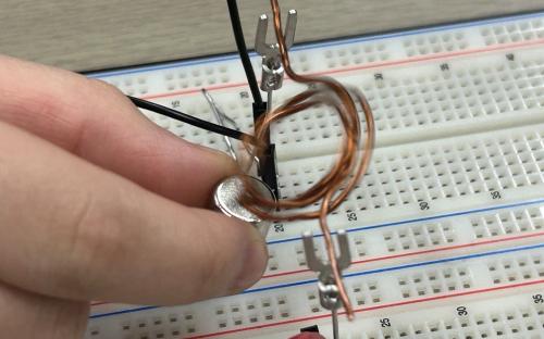 近くに磁石をおいて向きを調整すると、導線は磁石から逃げるように力が働いて、動きます。