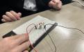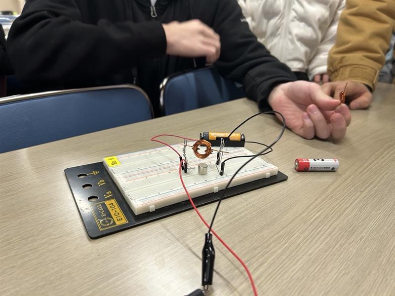 今日は、導線と電池と磁石でモータを作り、どのグループが一番早くきれいに回せるのかコンテストを行いました。