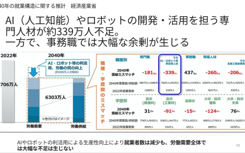 その中で、今後就業構造が変化しAI/ロボット技術者が大きく不足するそうです。その数約340万人?!。